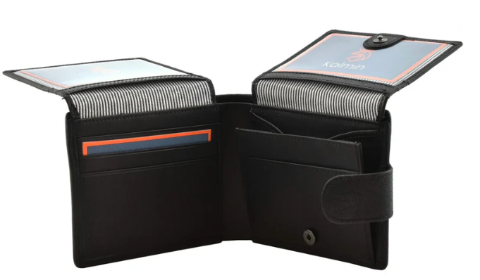Stay organized with the Black Leather Bifold Wallet by Kolmino, a timeless accessory for the modern individual. Crafted from premium black leather, this wallet features a sleek bifold design with multiple card slots, a bill compartment, and a secure flap closure. This version includes visible cards in the slots, showcasing its practical design for everyday use. The embossed Kolmino logo on the interior adds a touch of luxury, while the compact size ensures it fits comfortably in your pocket. Ideal for daily use, this wallet offers both functionality and sophistication, making it a must-have for men and women alike. Durable and stylish, it’s the perfect choice for those who value quality.