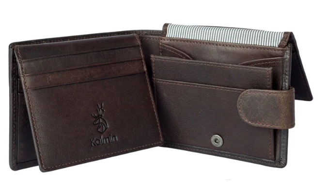 Black Leather Bifold Wallet by Kolmino with snap closure, card slots, and bill compartment. Classic design with added security.