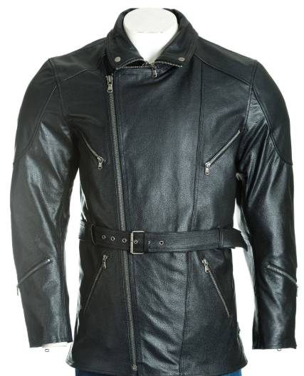 Black Leather Biker Coat by Kolmino with zippered pockets and belted waist. Classic and rugged for a timeless biker style.