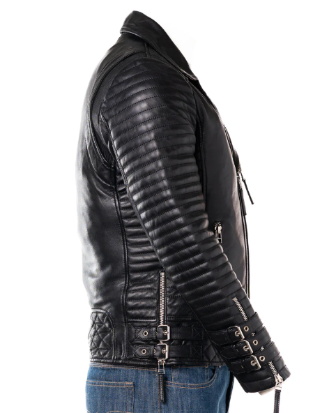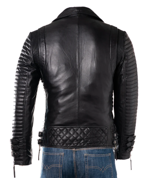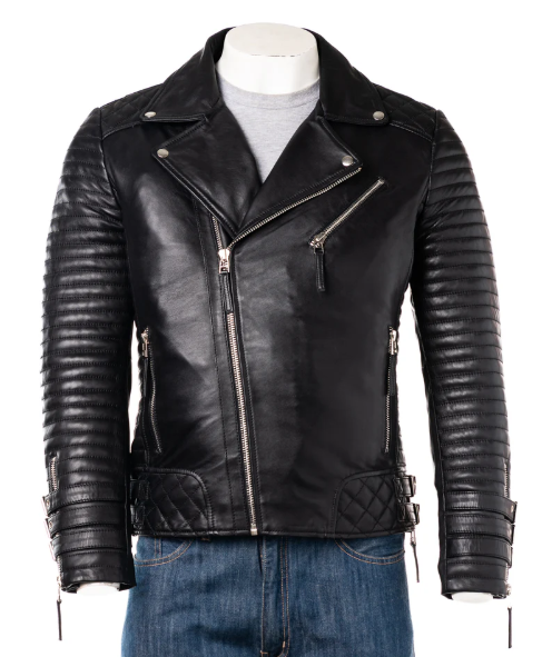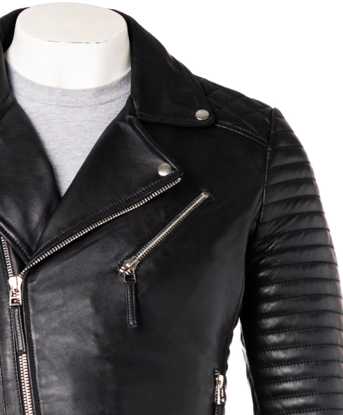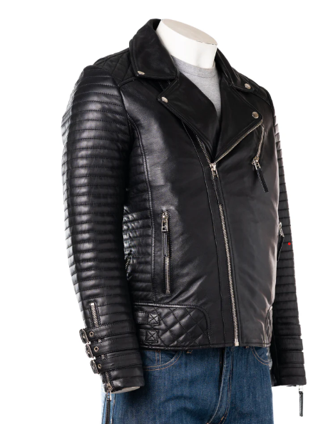 Black Leather Biker Jacket with Quilted Sleeves – Kolmino