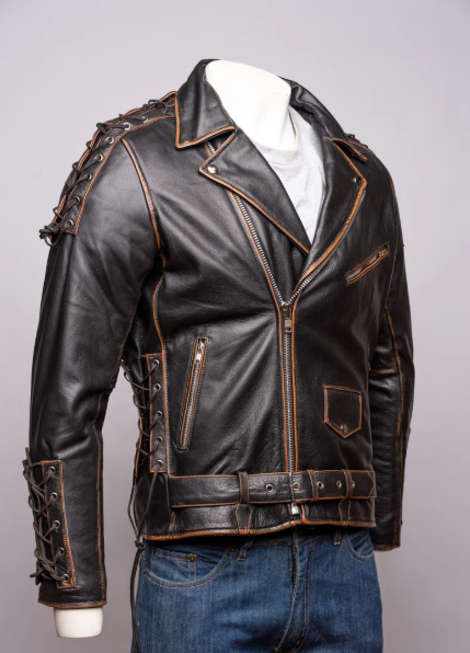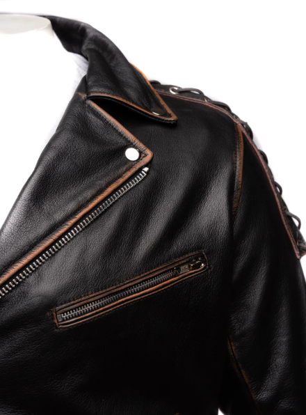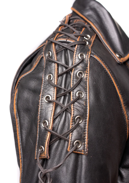 Black Leather Jacket by Kolmino with laced sides, brown trim, and asymmetrical zipper. Rugged and stylish for a biker-inspired vibe.