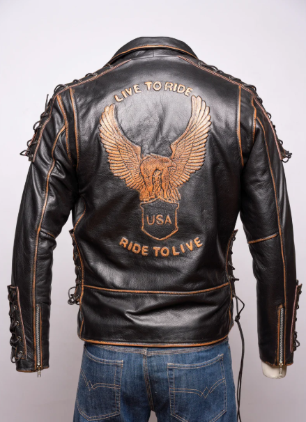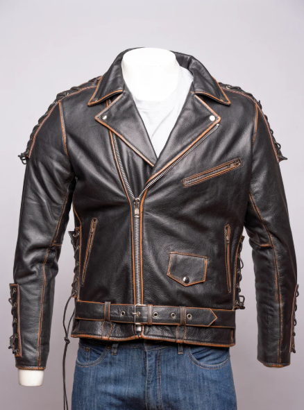 Make a bold statement with the Black Leather Jacket with Laced Sides by Kolmino. Crafted from premium black leather, this jacket features laced sides with brown leather trim for a rugged, biker-inspired look. The asymmetrical zippered front and belted waist provide a classic biker aesthetic, while the multiple pockets offer practicality for everyday use. Perfect for men who love a distinctive, rebellious style, this jacket is ideal for motorcycle rides or casual outings. Pair it with jeans and boots for an edgy, timeless look with Kolmino’s quality craftsmanship.