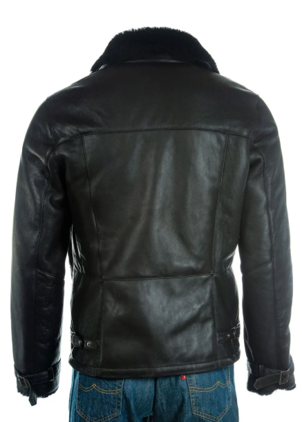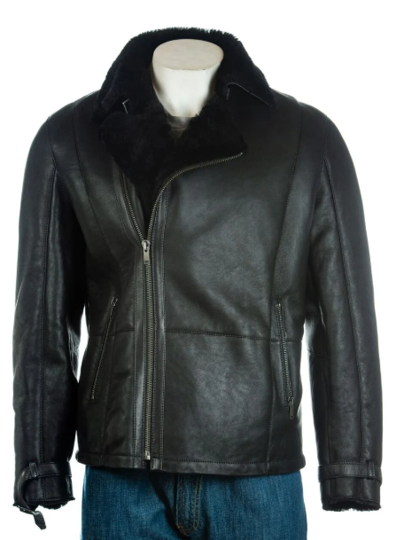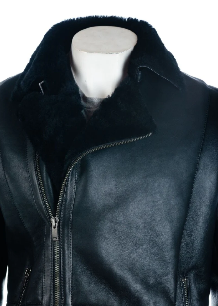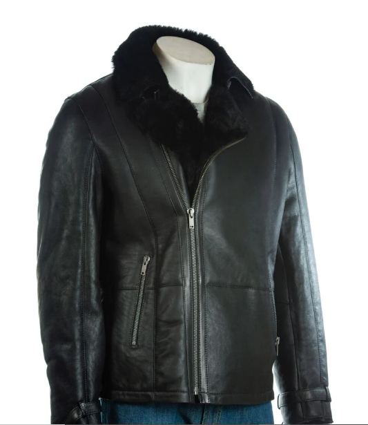 Stay warm and stylish with the Black Leather Jacket with Shearling Collar by Kolmino. Crafted from premium black leather, this jacket features a luxurious shearling collar that adds both warmth and a classic aviator aesthetic. The asymmetrical zippered front and side pockets provide a sleek, functional design, while the soft leather ensures durability and comfort. Perfect for men who want a timeless, rugged look, this jacket is ideal for cold-weather outings or casual adventures. Pair it with jeans and boots for a sophisticated yet effortless style with Kolmino’s quality craftsmanship.