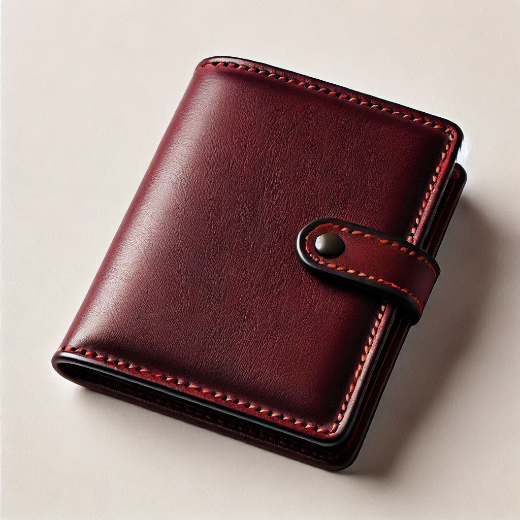 Burgundy Leather Wallet with snap closure and hand-stitched detailing. Sleek and spacious for daily use.