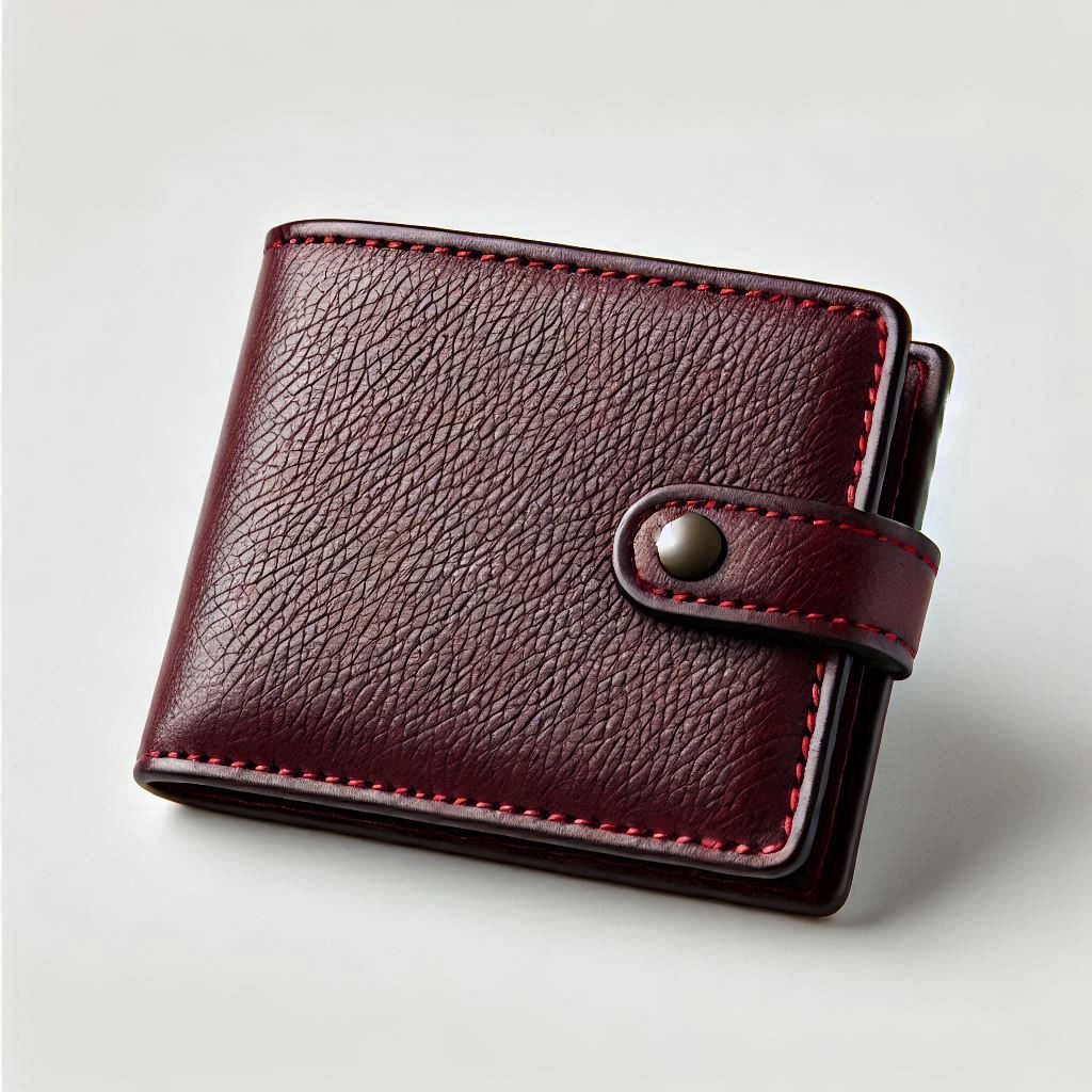 Burgundy Leather Wallet with snap closure and red stitching. Compact yet spacious for cards and cash.