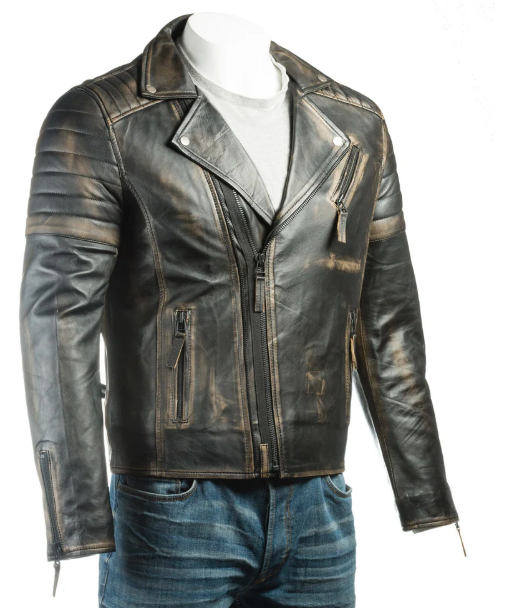 Distressed Black Leather Jacket by Kolmino with zippered pockets and quilted shoulders. Ideal for a rugged, biker-inspired look.