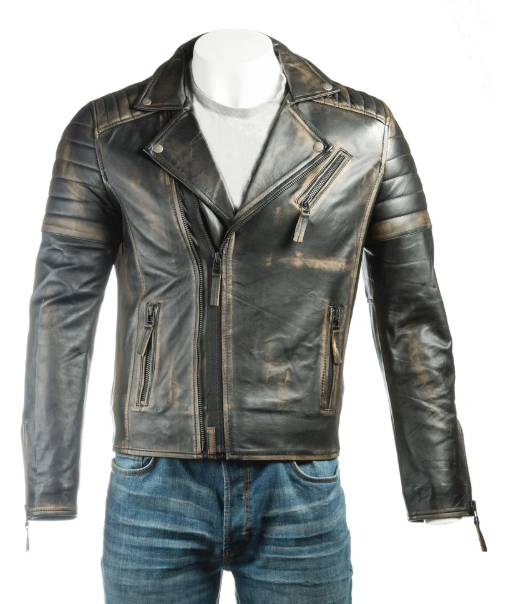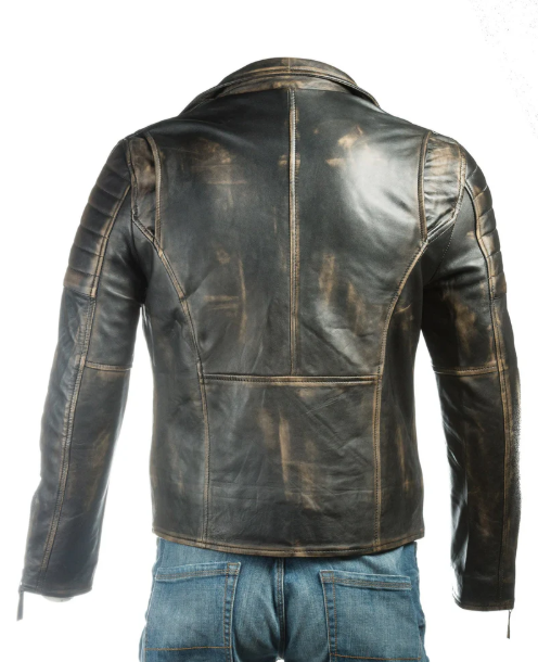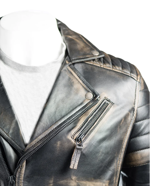 Distressed Black Leather Jacket with Zippered Pockets – Kolmino