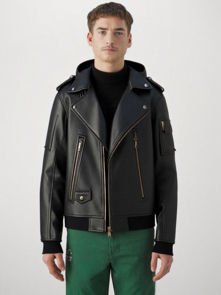 Edgy black leather biker jacket with a detachable hood for versatile styling. Perfect for layering or wearing solo.