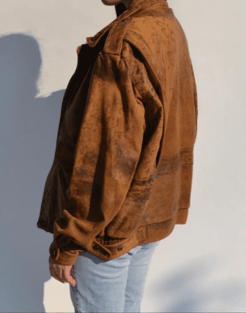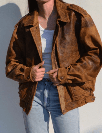 Tan leather bomber jacket with distressed finish and button-flap pockets.