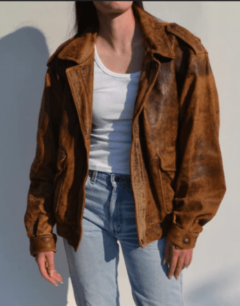 This vintage tan leather bomber jacket features a distressed finish for a rugged, worn-in look. It includes a front zipper, side pockets with button flaps, and a fitted design with adjustable straps at the waist. Crafted from high-quality leather, it offers durability and a classic aviator style perfect for casual wear.